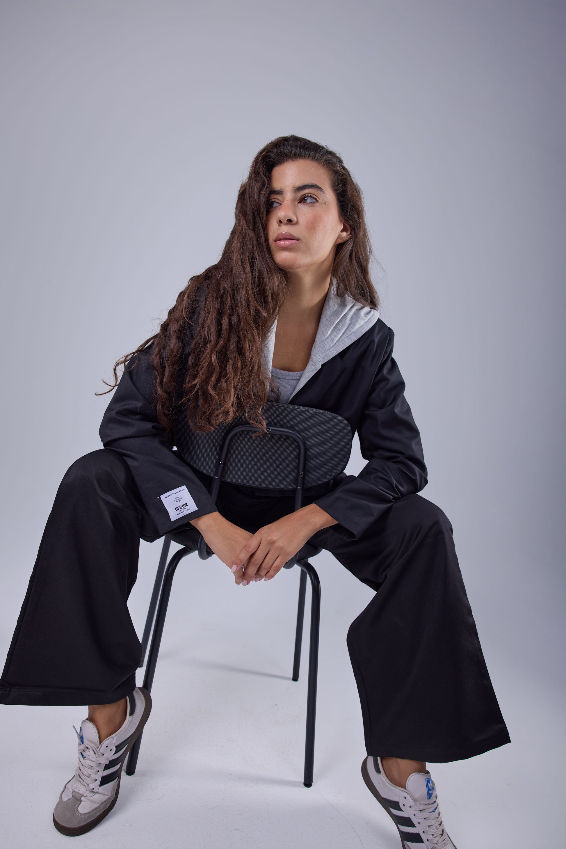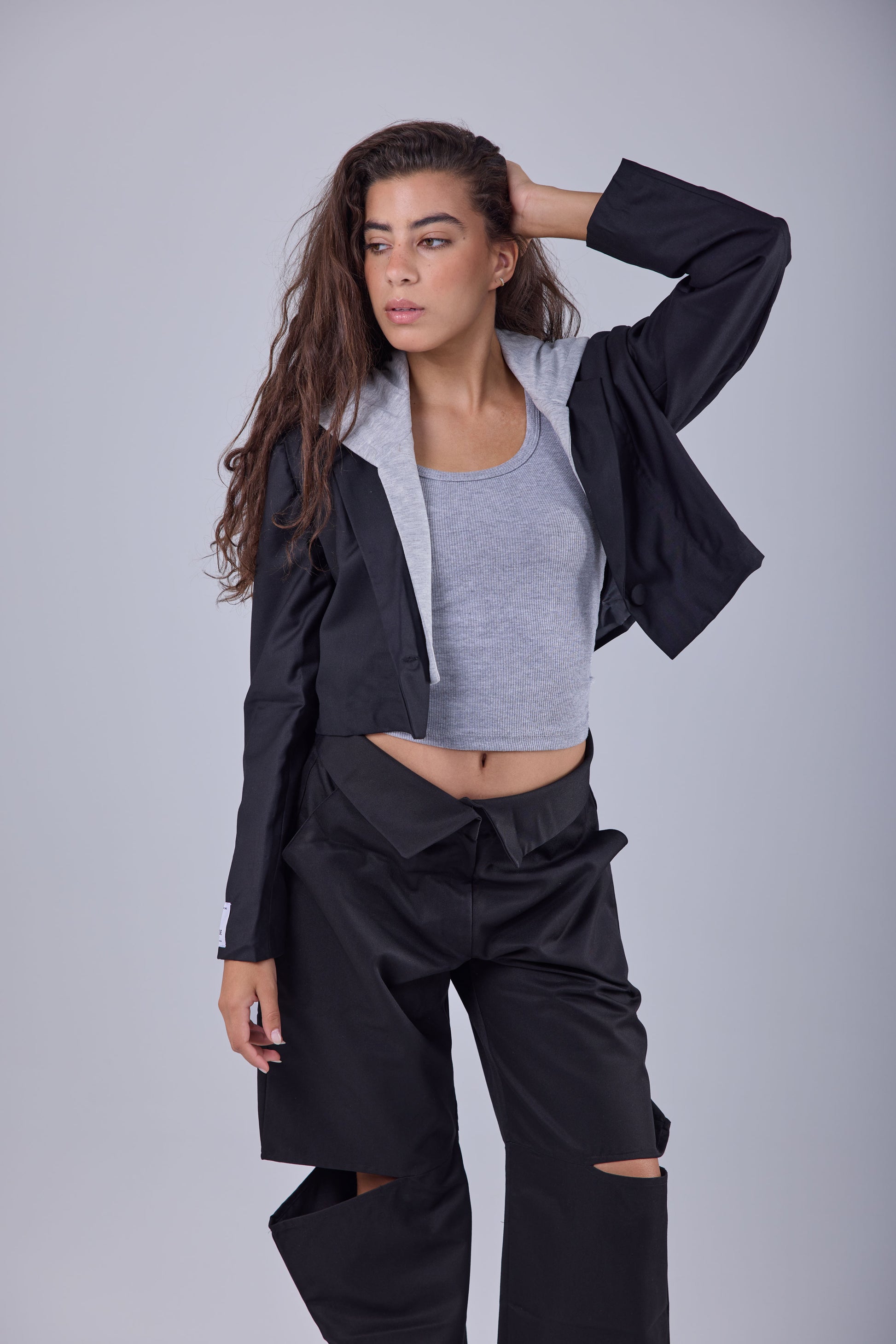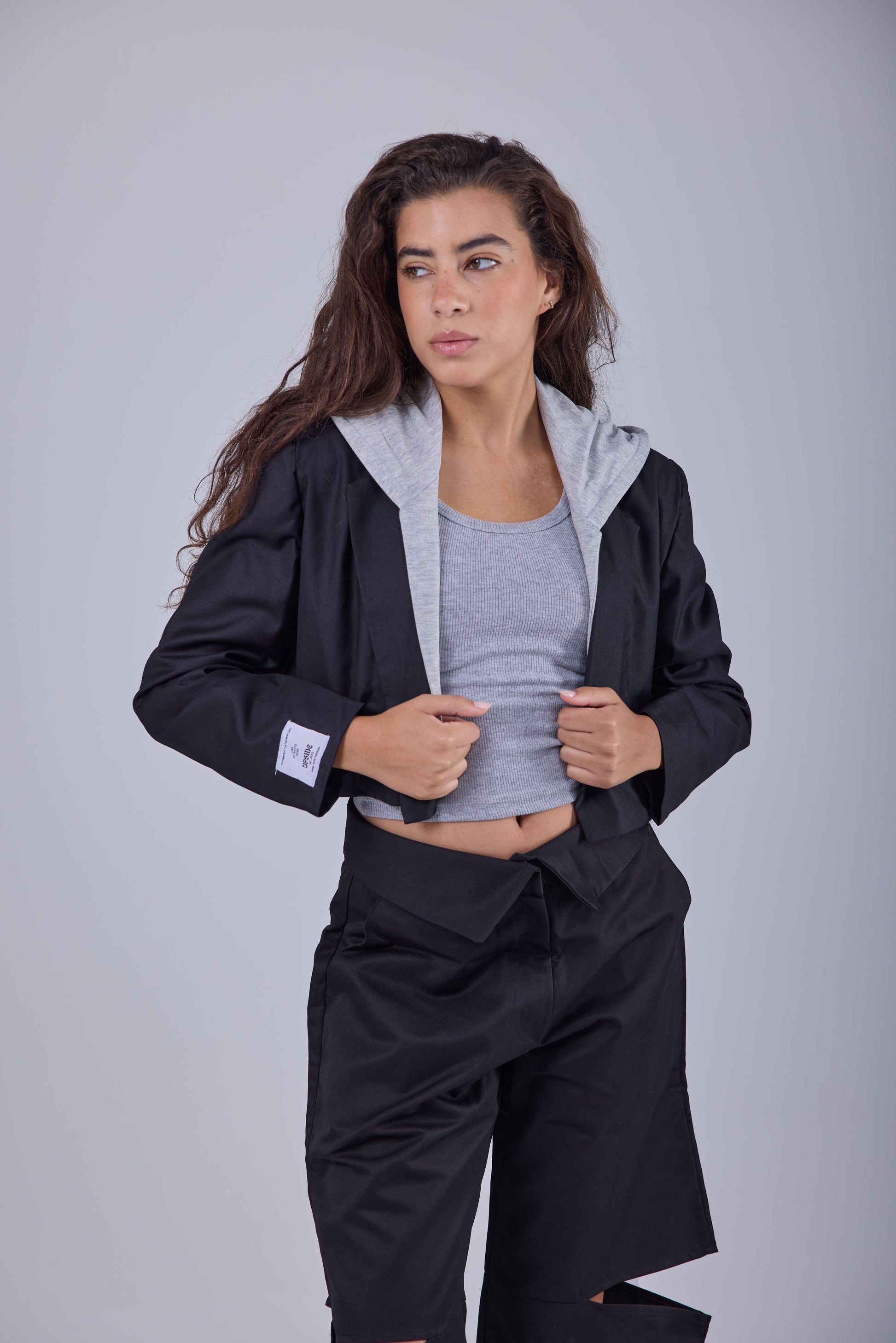 Blazer with an attached grey hoodie.